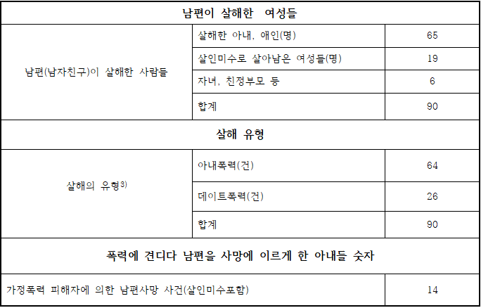 불행히도 한국에는 아직까지 아내살해나 데이트 상대자에 의한 살해에 대한 공식통계가 없다. 대검찰청의 ‘2011 범죄분석’에 의하면, 2010년 기준으로 1년 동안 살해당한 전체 여성수가 465명1)에 이른다는 점 외에 살인범죄의 성별적 특성에 대해서 알 수 있는 바는 거의 없다. 특히, 피해자와 가해자와의 관계에 대한 성별 분리 통계가 없고, 관계 항목에 배우자가 별도로 구분되지 않았기 때문에 여성에 대한 폭력의 극단적 결과로서의 살인사건 발생수에 대한 추정치조차 알 수가 없는 상황이다. 다만, 대부분의 살인사건이 애인, 친족, 지인 등 가까운 사이에서 발생한다는 점에서, 우리나라 ‘부부폭력’ 발생률이 65.6%2)라는 점에서, 그리고 가정폭력 피해자의 절대다수가 여성이라는 점 등을 고려할 때, 가정폭력이나 데이트폭력에 의해 살해된 여성수는 65명을 훨씬 웃돌 것으로 예측할 뿐이다.