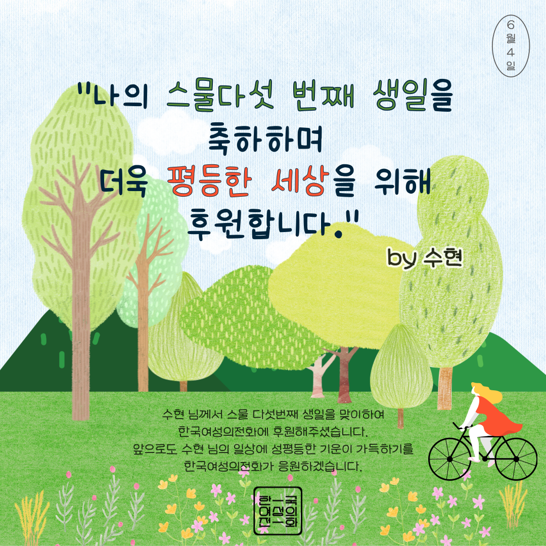 수현 님께서 스물다섯 번째 생일을 축하하며 한국여성의전화에 후원으로 함께해주셨습니다. 생일을 기념하여 더욱 평등한 세상을 위해 후원하셨다는 수현 님의 따뜻한 마음을 한국여성의전화가 항상 곁에서 응원하겠습니다!