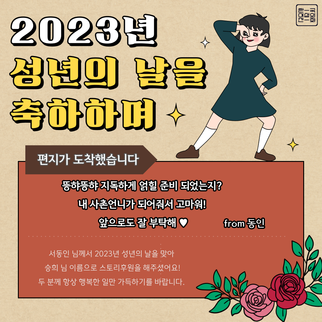 올해도 성년의 날을 맞아 서동인 님께서 스토리후원을 보내주셨습니다. 2023년의 주인공은 채승희 님! 동인 님께서는 승희 님 덕분에 힘든 순간을 견딜 수 있었고 든든하게 살아가고 있다며 감동의 메시지를 전해주셨어요. 두 분의 일상에 행복한 일만 가득하기를 한국여성의전화가 응원하겠습니다.
