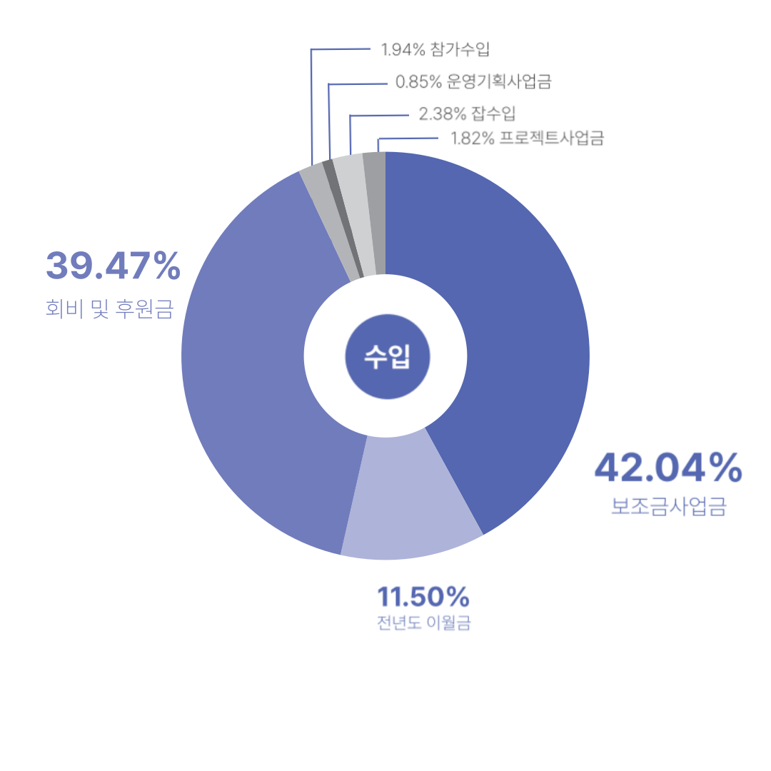 | 회비 및 후원금 | 504,994,980 | 26.32% | 정회원, 이사, 후원회원, 지부 등 본회 구성원의 정기후원금 |