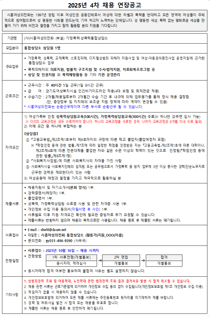 1. (사)시흥여성의전화 통합상담소 활동가 1명 채용공고(2025년 4차 연장공고).hwp